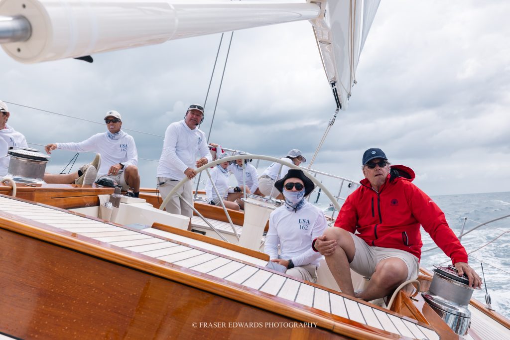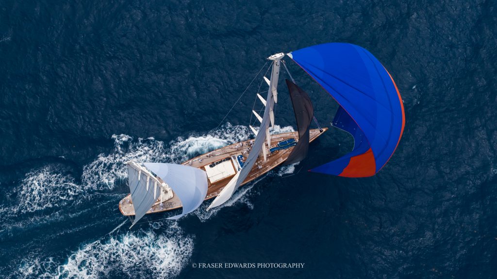 The 213ft three-masted gaff schooner Adix, captained by Oliver Bell, executed the best start in the class, just three seconds shy of the line at their starting signal. The fisherman sail on Adix is one of the most distinctive features of the schooner’s remarkable rig. Set between the main and mizzen mast on Adix, this large quadrilateral sail fills the gap between the rigs, increasing sail area when reaching or running. Developed on classic racing schooners to maximise power, its origin can be traced back to the great racing schooners of the late 19th century.